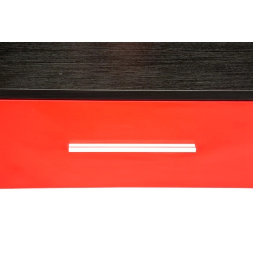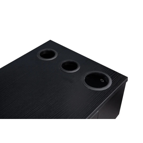 - The surface is veneer-faced decorative Particle Board showing slick uniform black color.