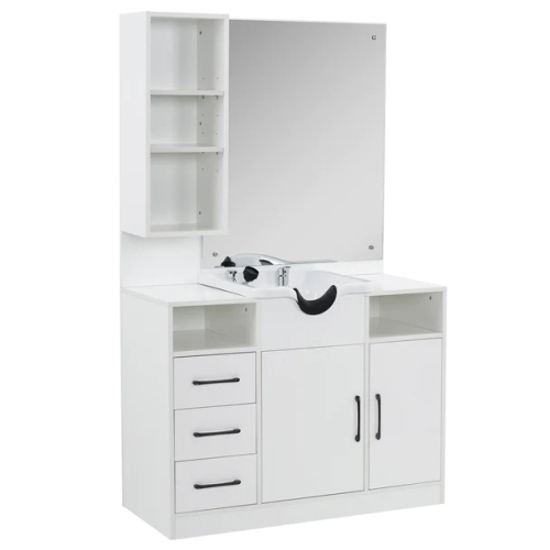 - easy to use: This easy-to-use shampoo station spacious storage help you to sort products in order and serve customers with ease since you can find your common tools You only need to adjust the barber chair to the right angle to wash the hair of the customer conveniently.