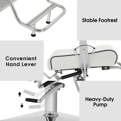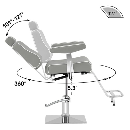 - High Practicability - Removable&Adjustable headrest. 360° Swivel with locking mechanism provides versatility. You can adjust the height of the headrest to suit the height of the customer. The backrest can be tilted up to 127 degrees so you can provide eyebrow tattooing, shaving and other services to your customers. (Backrest can be easily adjusted to multiple locking positions by a gas-piston lock & release mechanism). You can adjust the height of the pump by the foot lever, and the pump can be adjusted up to 5.3 inches.