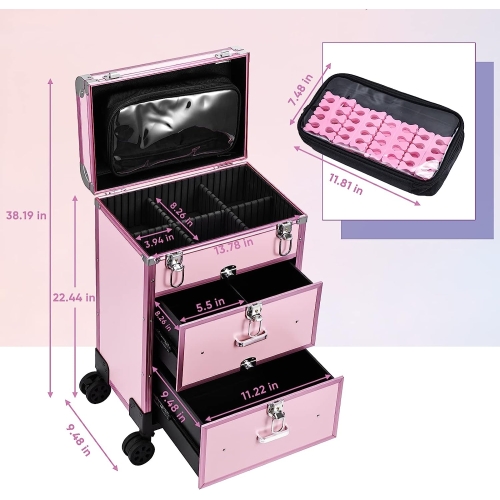 - Extra Large Makeup Train Case with Wheels: Size(H*W*L): 22.44*9.48*8.26; The 1st layer is with large PVC makeup bag and divided makeup box, small pieces such as makeup brush, lipstick, nail gel, nail polish, and so on can be organized neatly here. The second layer with two medium compartments is suitable for full-sized cosmetics (palettes, makeup foundations), the bottom layer is designed for tools for makeup / nail art / hairdressing, such as spray, nail lamp, nail file, hair dryer, hair curler