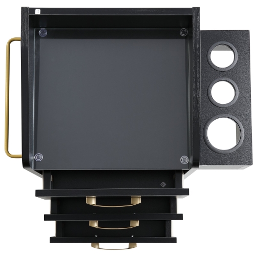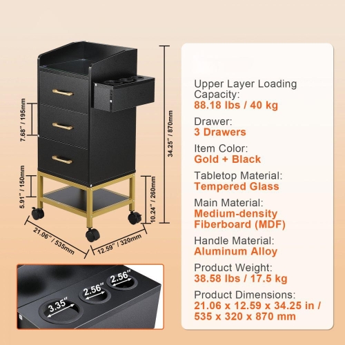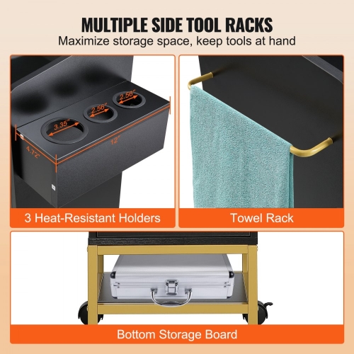 - Large Storage Capacity: 3 convenient slide-out drawers for beauty and hairdressing tools, 3 heat-resistant holders for hairdryers. Extra bottom plate for bulky items like shampoo. A towel rack on the right side also can be a handle to push the trolley. You'll have all your essentials neatly organized and easily accessible.