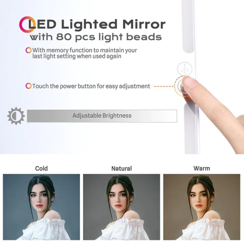 - Vanity Mirror with 80 pcs light beads provides 3 color modes including cold, natural & warm white & adjustable brightness