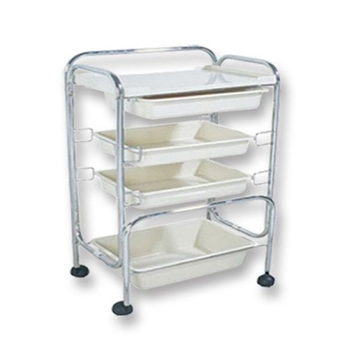 Plastic rolling cart to quickly and easily store products or keep them in reach during sessions.