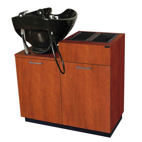 The Deluxe Backwash Shampoo Unit by Collins is made 100% in the USA, and is designed and built with functionality and durability at the forefront. This deluxe backwash is perfect for any salon, and includes the Collins CB87 Tilting Shampoo Bowl with fixtures and vacuum breaker. This unit also provides you with two molded bottle wells, tilt-out soiled towel bin and additional cabinet door for access to the hidden plumbing. The cabinet and towel-bin both feature contemporary steel pulls, and this unit comes in your choice of 8 laminate colors.