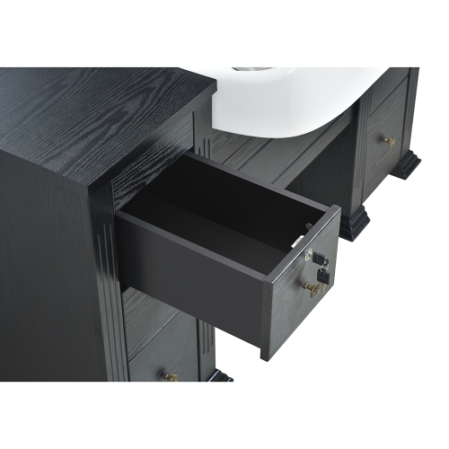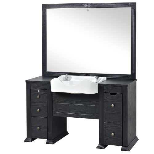 The Insignia Classic Barber station is meticulously crafted for the utmost convenience and comfort. By improving upon the traditional barber station with thoughtful storage and plumbing options, the Insignia barber station dutifully functions as both front wash unit and styling station. As a fully equipped barber station, the Insignia sports a polished ceramic shampoo bowl, wall mounted mirror, and spacious cabinets, complete with storage slots for salon equipment. With additional sink and plumbing accessories included and availability in elegant color trims, the Insignia’s rich feature set stands out amongst its professional barber station peers.