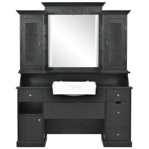 The Mohegan barber styling station has a shampoo bowl, a wall-mounted mirror, and a free-standing vanity station. It boasts of ample storage space with multiple drawers and cabinets, including two large shelved display cabinets and a cabinet with storage slots for salon equipment.