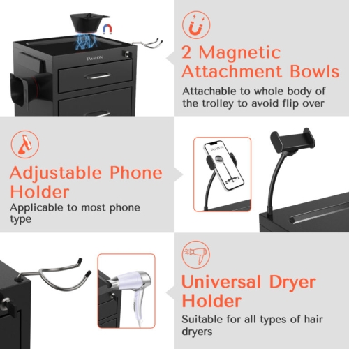 - NEW UPGRADE FOR EXTRA CONVENIENCE with two side plastic buckets,two magnetic bowls, one mobile phone holder, one heat-resistant hair dryer holder, two pull-out drawers one lockable , one dryer holder. A multifunctional rolling trolley cart that can meet your needs in any occasion.