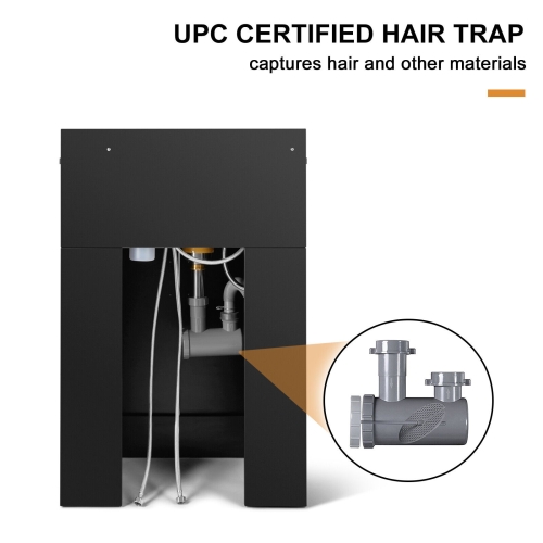 - Unique design: Classic and contemporary look brings upper taste into the barbershop. There is a 5-inch wide area on the console where you could place some shampoo and conditioner. The front opening door makes installation more convenient and can be used for storage at the same time. It can meet the drainage on the ground and the drainage on the wall.