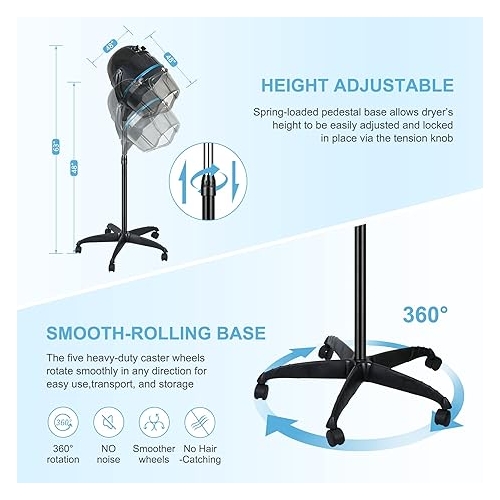 • Rolling Base & Adjustable Height : This professional rolling hair dryer easily adjusts from 49" to 65" to fit your or your customers' height perfectly, while 5 updated high-quality casters ensure convenient to move anywhere in your home or salon. Important: Plz make sure the long bolt on the middle of the bottom base is tight. Once the legs are supported, the top portion will stay in place firmly.