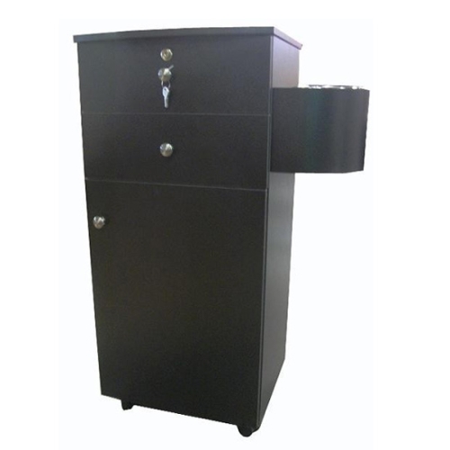 Add a modern touch to any salon with this beautiful laminate cabinet. Cabinet features two drawer over a storage cabinet on casters with one drawer featuring a lock. The matte finish is compatible with our other salon furnishings and can be purchased as a package or as individual components to create a custom salon décor. This stylish Mobile Station features a side piece with chrome appliance holders in various sizes.