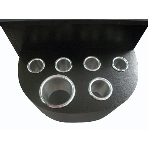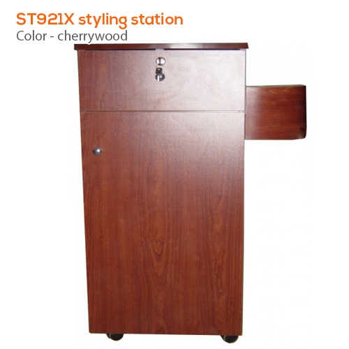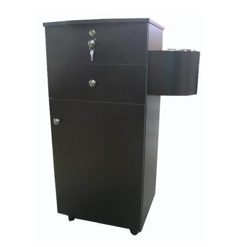 Add a modern touch to any salon with this beautiful laminate cabinet. Cabinet features two drawer over a storage cabinet on casters with one drawer featuring a lock. The matte finish is compatible with our other salon furnishings and can be purchased as a package or as individual components to create a custom salon décor. This stylish Mobile Station features a side piece with chrome appliance holders in various sizes.