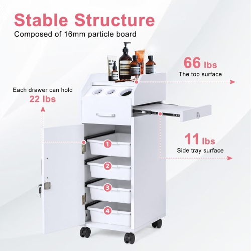 - 4 Large Capacity Drawers - This salon trolley has 4 drawers, and these tray style drawers will give you plenty of room for a variety of grooming tools and supplies. The drawer is made of custom ABS material, which is more durable and not easy to damage.