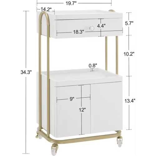 The white golden salon trolley is an excellent choice for your barber shop, nail salon and SPA shop. The cart features streamlined design that comes with both aesthetics and practicality. With 4 universal wheels, 2 of which are lockable, it can be easily moved and securely fixed as needed. This trolley can meet your needs of daily storage and easy to move anywhere.