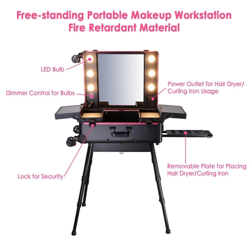 - Free-standing portable makeup workstation with Lights, perfect for studio and artist making up. Carry a Rolling Makeup Suitcase for traveling.