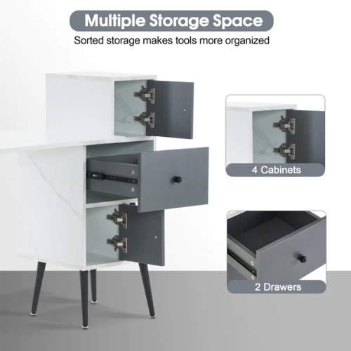 - Reasonable storage space: This salon station has a fully enclosed storage design including 4 cabinets and 2 large drawers with round metal handles. The spacious 39.4 inch wide table top provides a comfortable and free space for nail tech work.