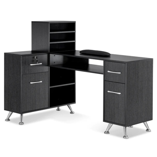 If you are looking for an ample manicure table with several drawers, shelves and storage cabinets, this is it! With functional and attractive design, this L-shaped desk fits a variety of scenarios in the salon store or office. With spacious desktop for both side, you can also able to use the free space to hold many nail supplies and work more effectively.