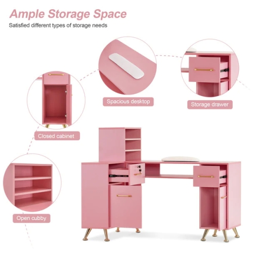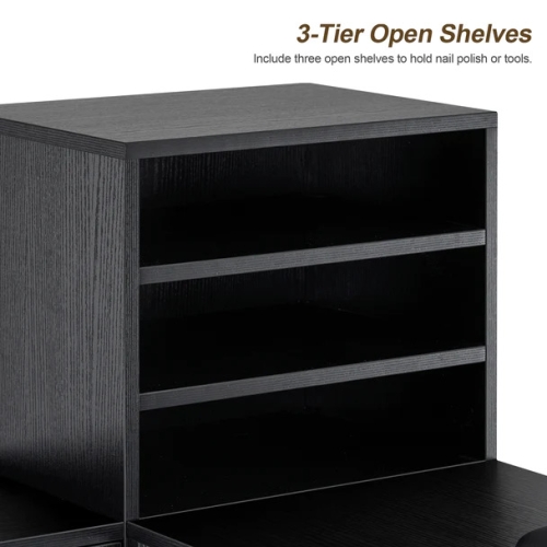 - Wide Desktop: The nail desk features L-shaped design allowing for space-saving. Meanwhile, it offers 2 spacious desktops that provide sufficient space you need for all the manicure tools like nail polish, filer and so on. For the big open shelves, it can be placed the nail lamp to simplify the space reasonably.