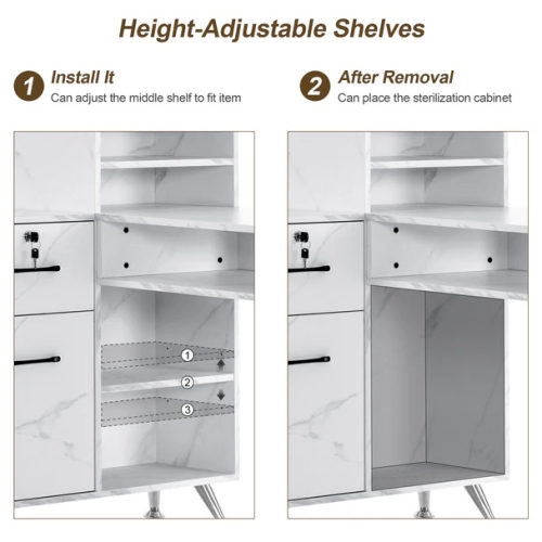- Sufficient Space & Adjustable: This storage station features 1 big open shelf, 2 drawers, 2 cabinets and 5-tier side-open shelves, which have enough room to manage products, keeping all tools organized and desktop orderly free. The lower 2-tier open shelves have three heights that can be adjusted according to needs.