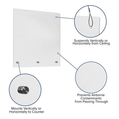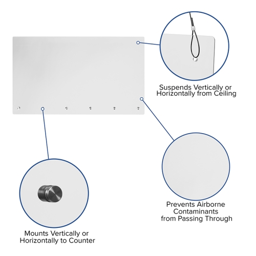 This hanging clear shield acts as a physical barrier and helps to maintain safe spacing between employees and customers. This multi-directional sneeze guard shield may be suspended or mounted either vertically or horizontally and be height customized up to a 50" drop from the structure. This partition can fit almost any purpose and allows you to decide which areas to protect and gives a larger area of protection. This acrylic shield can be suspended from the ceiling or mounted to the counter, hardware is included for both options.