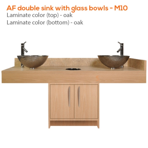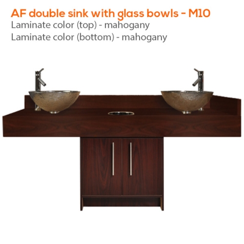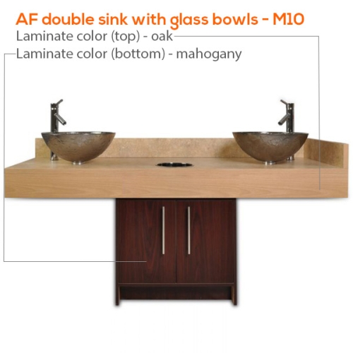 Mahogany & terra roca laminate combination equipped with 2 modern sink faucets and 2 glass bowls