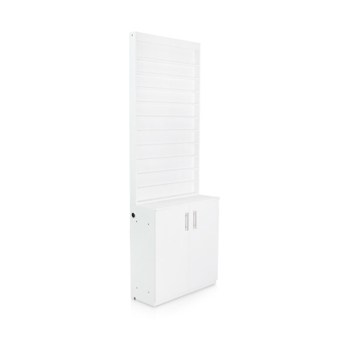 A gorgeous white cabinet to display nail polish and gel. If using along with the DreaMau, showcase your custom-made polish and gel colors to advertise the valuable service you provide—the ability to create any shade a customer requests in minutes.