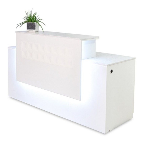 Create a stunning first impression with the sophisticated Regis Reception Counter. This beautiful dual-level counter greets customers with glowing LED lighting and luxurious white marble, offset by a simple all-white modern design that looks fabulous with any existing décor or color scheme. The Regis Counter is also highly functional with power receptacles, USB chargers, and generous counter space and storage compartments for supplies.