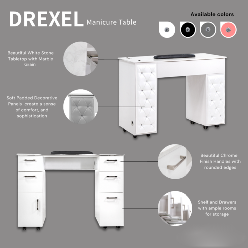 Introducing MAYAKOBA's newest Manicure Table Collection - DREXEL, a professional table with wood construction and acetone resistant finish. The front soft-padded decorative panels create a sense of comfort and elegance. It adds an upscale feeling to your manicure space with the option of four different colors to choose from, lets you find the perfect tone to suit your unique salon space. Specifications & Key Features