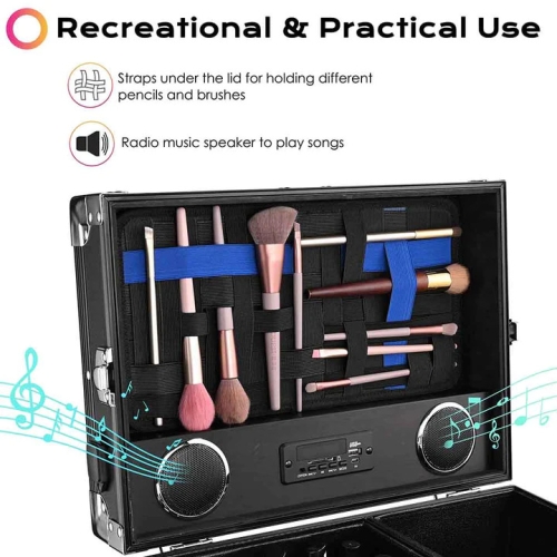 - With elastic straps under the case lid to hold different sizes makeup brushes and nail drill pencils