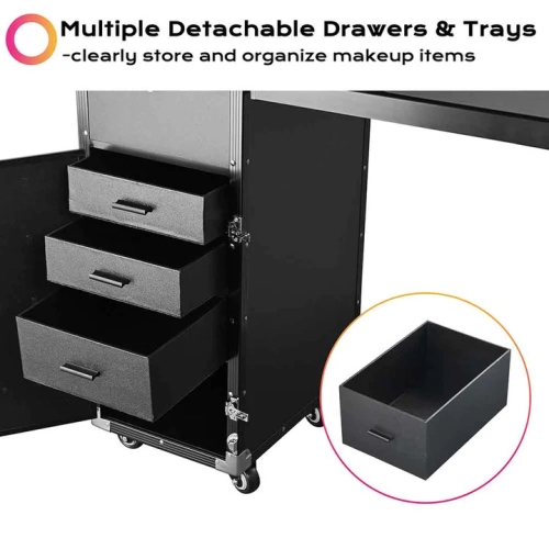 Portable Makeup Workstation is suitable for left-handed makeup artists and Nail tech. Featuring expandable floor-standing table, can be used as an extra make up workstation area even in outdoor. Makeup case capacity is up to 55Lbs in total.