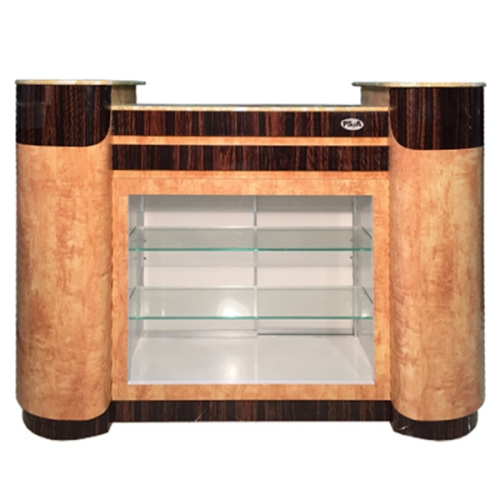 63" wide spacy and well fitted reception counter. Well crafted with 2-tone color. Comes with lockset, 2 glass shelves for supply display.