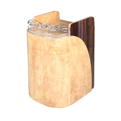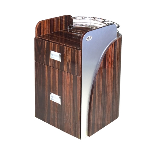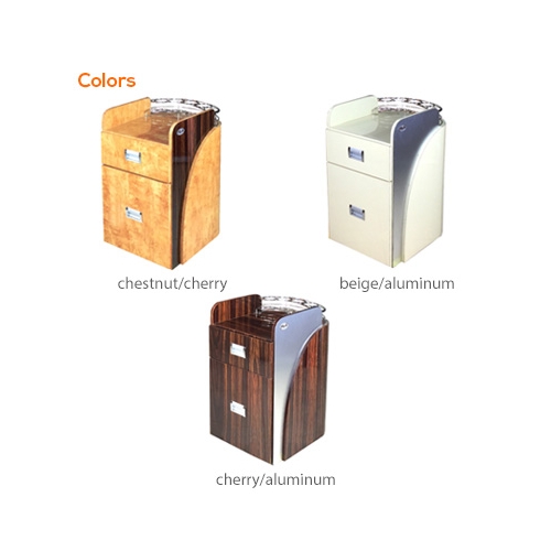Alumminum accent for easy cleaning and slick looks with 2-tone color, it is built with commercial grade formica. This is hard to find item. It comes with stainless steel rack for nail polish and other chemical bottles.
