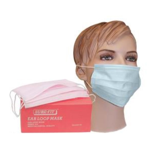Three layer ear loop face masks are available in blue and pink. These protects against inhalation of airborne dust and particles.