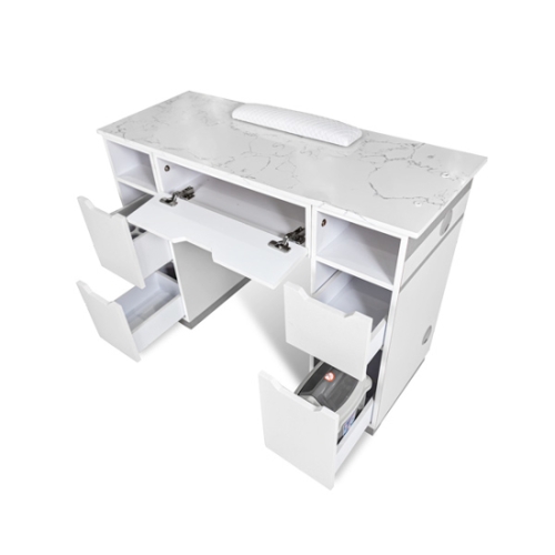 Elevate Your Nail Salon with the Sleek Light Grey Snow White Quartz Manicure Table! Unleash your creativity on our meticulously crafted manicure table, a fusion of style and functionality. Adorned in a chic light grey hue, and crowned with a pristine Snow White Quartz countertop, this table is a statement of sophistication. Standing at a comfortable height of 31", it offers the perfect canvas for your nail artistry. The compact yet ample design, measuring 16" in width and 42" in length, ensures a seamless fit in any studio layout. Organization meets elegance with an intelligently designed opened front drawer, guaranteeing easy access to your tools. Effortless mobility is at your fingertips with included wheels, while the integrated trash bin promotes a tidy workspace. Revel in comfort as you work, thanks to the thoughtful handrest. Revitalize your salon with this manicure table, equipped with a 6-month warranty for peace of mind.