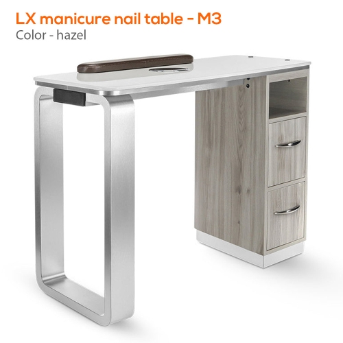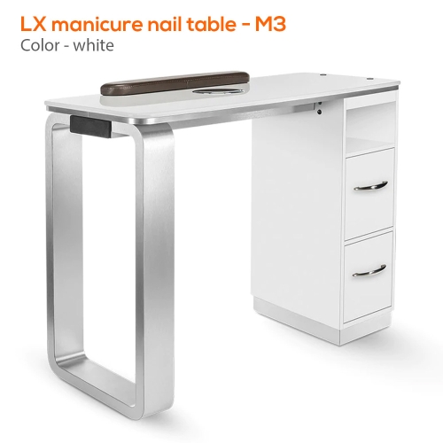 Indulge in Luxury with the LX Manicure Nail Table - M3: Where Artistry Meets Elegance! Elevate your salon experience with a touch of opulence and innovation. The composite marble top, adorned with captivating speckles, not only exudes high-class aesthetics but also prioritizes hygiene. The acetone-resistant gel coat ensures lasting beauty, while brushed metal accents add a subtle gleam of sophistication. Chrome draw handles offer a seamless touch, while the removable organizing caddy keeps your tools at your fingertips. Enhance comfort during long sessions with the integrated wrist rest. Designed for perfection, it's even ventilation-ready. Unveil a world of luxury and creativity with the LX M3 manicure nail table.
