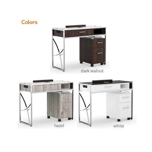 Discover Elegance Redefined with the LX Manicure Nail Table - M4: Where Style Meets Function! Elevate your salon experience with this stunning rolling manicure table. Available in timeless white, rich dark hazel, or warm walnut, its sleek modern design seamlessly blends aesthetics and functionality. Unleash your creativity with three spacious drawers for all your essentials, keeping your workspace clutter-free. Glide effortlessly through your salon on smooth rollers, while the LX M4 adds a touch of sophistication to your nail artistry. Elevate your space, elevate your art – with LX M4.