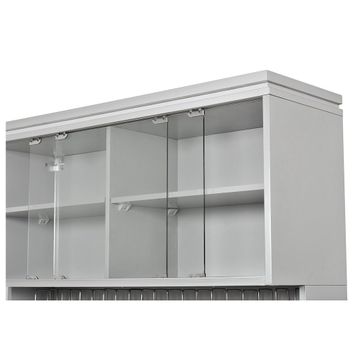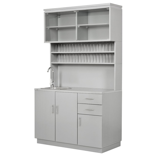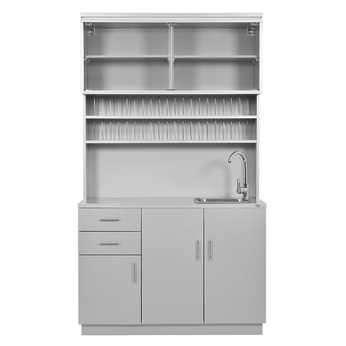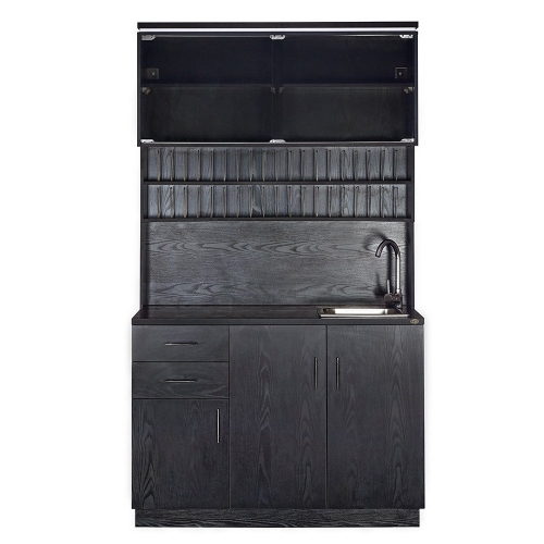 Color Bar Maple with wash sink. Maintaining a clean space for mixing & combining chemicals has never been easier. This unit features spacious cabinets, drawers, and stacking hair color storage slots. The counter top is made from water-proof wooden material for easy-to-clean work-space along with long lasting use, with a bonus pull out cabinet to house trash can for unwanted trash. This units includes a chemical storage rack below and spacious glass sliding door cabinets to house towels and display shelves for products. The stainless steel sink also comes with a single handle faucet and drain assembly, all water supply lines included.