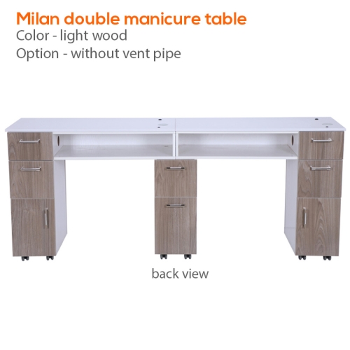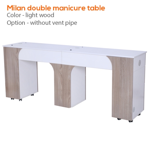 The Milan manicure nail table by Mayakoba is the perfect option for salon professionals with a medium to large sized salon. This table features a solid white wood with an accent of either ash wood or ash grey. The Milan double is a cost and space efficient alternative to purchasing two separate manicure tables. This table is designed with a simple yet beautiful visual appeal that can be seen in the curvature along the client facing table side. This table is upgradable with vent piping and comes with 8 durable casters for easy movement.