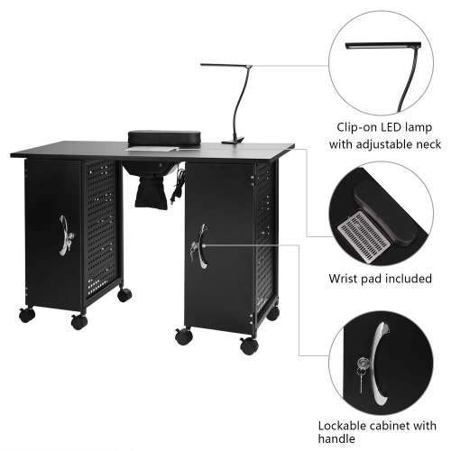 Electric dust collector is equipped to help collect nail dust. And the manicure table also comes with a wrist rest that is not fixed to the table, convenient for you to adjust its position. | 2 lockable side cabinets, each with 5 removable PP drawers, provide you with enough space for storage. | The manicure table is designed with 8 rolling wheels for easy mobility. And 4 of the wheels are lockable. When you want it to stay in one place more securely, just lock the wheels. | A LED lamp is included. Gooseneck and clip-on design makes it easy for you to adjust its angle and position to meet your own needs. |