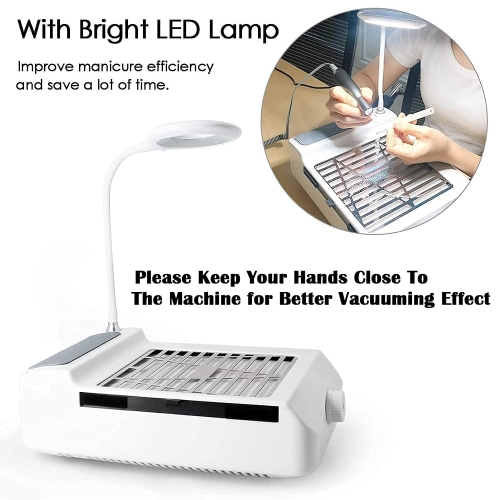 • Package List: 1 x nail dust collector with lamp, 1 x US plug, 1 set stainless steel cuticle pusher kit, 1 x user manual. [Excellent Heat Dissipation Performance] This nail vacuum collector with a hollow back design, can easily dissipate the heat generated by the machine and long lasting.