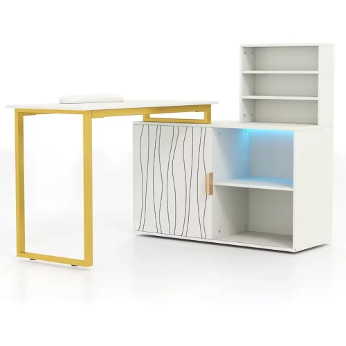 - PERSONALIZED DESIGN - The whole storage shelf above it can be installed on one side of the desktop. With 1.5M long power cord, two 3-prong AC outlet and 2 USB ports, this manicure table offers you enough charging space for your electronic devices