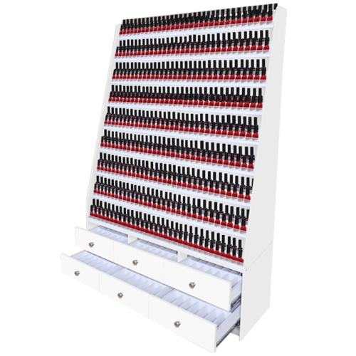 The "Sonoma" 2 tiered polish rack will hold over 500 bottles of nail polish. The open, slanted front has an acrylic lip so that your customers can see the variety of color choices. A 53.5" H top sets on a 14.5" H cabinet with 6 convenient, separate drawers for storing your excess product.