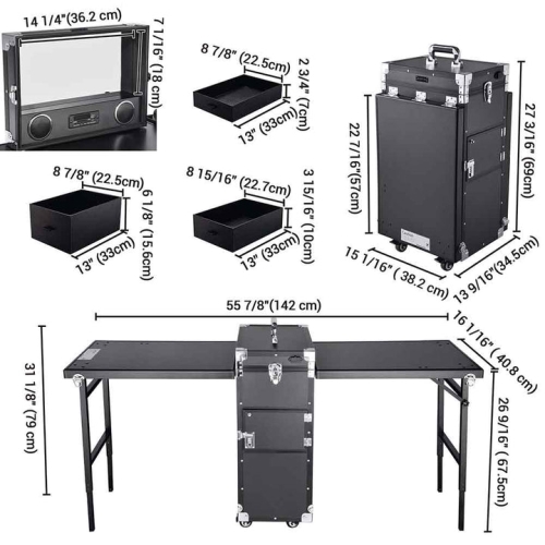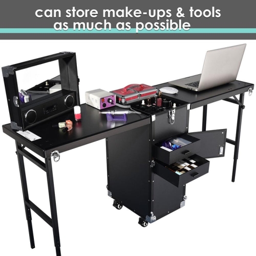 - 56"x16"x31" portable art nail & makeup workstation with 4pcs 360-degree rotated wheels including 2 lockable wheels, featuring 2 expandable floor-standing tabletops and full-size mirror for turning into an independent make up workstation instantly even in outdoors; Suitable for outdoor use, such as street performances, temporary make-up room or accessories stall in flea market