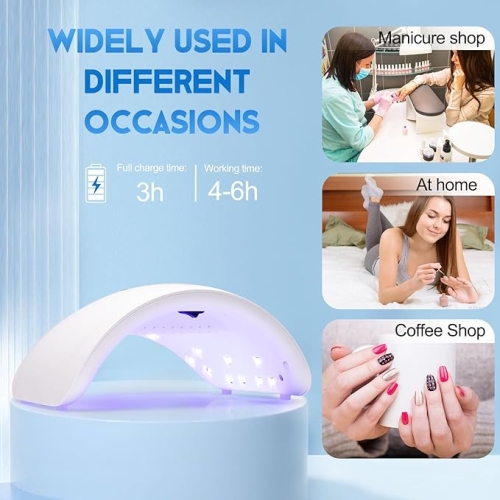 - Cordless Nail Lamp: This cordless led nail lamp built-in rechargeable battery can be used for 4-6 hours after full charge (3h). The battery icon on the display flashes to indicate charging, and it stops flashing to indicate a full charge. Such portable curing nail lamp is suitable for home and outdoor use, you can take it with you.