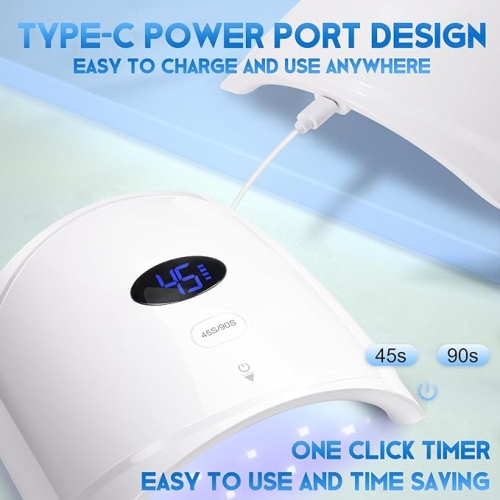 - Well-made & Easy to Use: This 48 watt nail dryer for gel polish with good-looking pure white color, the design of the curved lines increases the internal space and make it easy to cure 5 fingernails or toenails at the same time. Type-C power port design, easy to charge and use anywhere.