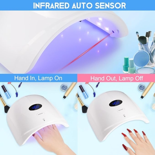 - Automatic Sensor: There are 2 timers (45s/90s) that can be selected according to the time you required for different gel polishes.LCD display shows curing time more clear.Our rechargeable uv led nail lamp is equipped with infrared auto-sensor, after turning on the bottom switch, hand-in light, and hand-out light off.