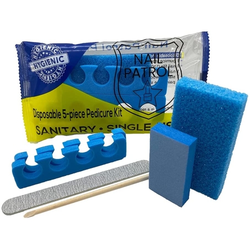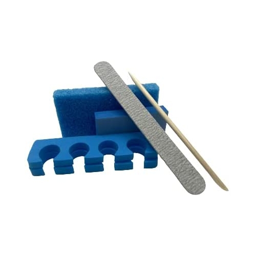 5-piece PEDICURE KIT: Includes 3.5 x 1.7 x 0.3 in. blue pumice, 180/240 grit blue buffer, 180/240 grit zebra nail file, blue toe separators, 11 cm wooden stick Works great for PROFESSIONAL or CONSUMER use: all the products are very gentle on nails and skin to use it on yourself, yet very effective.