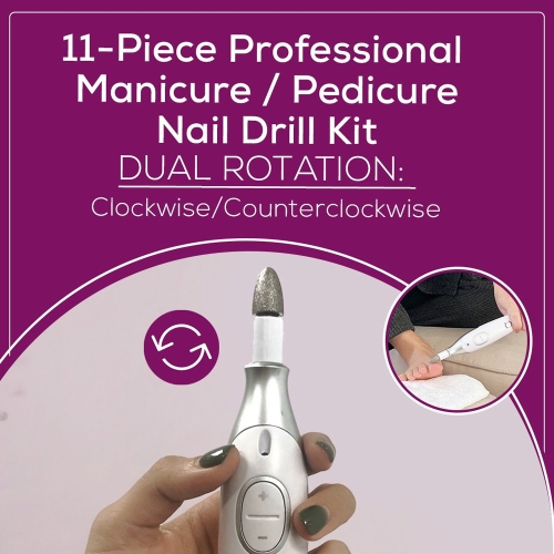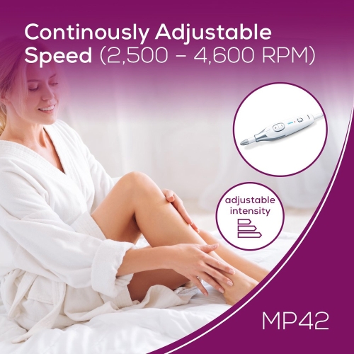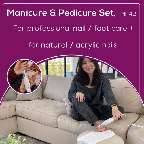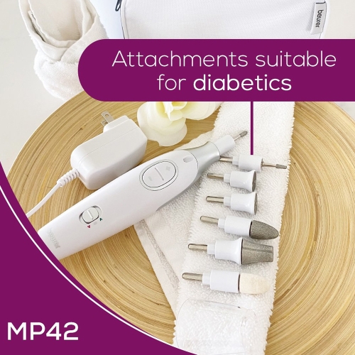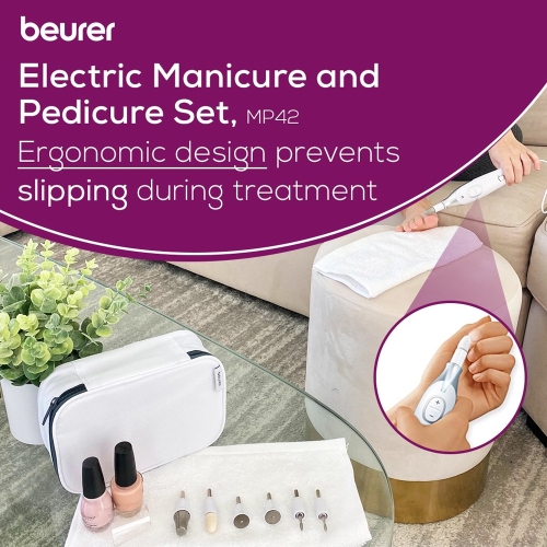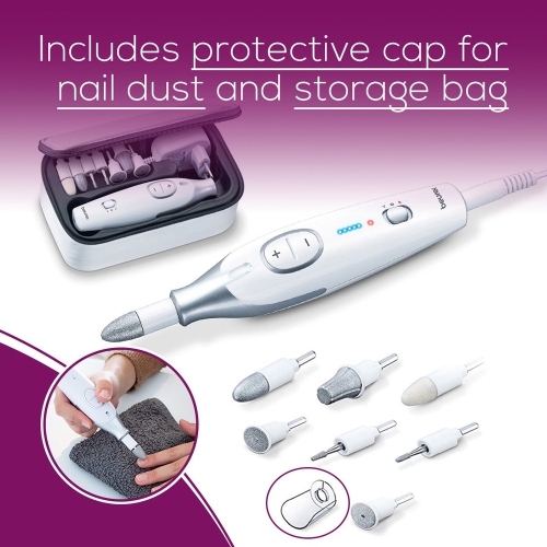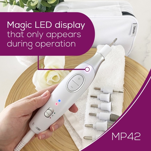 The Beurer Electric Manicure and Pedicure Set achieves professional nail and foot care in the comfort of your own home, for both natural and acrylic nails. The MP42 includes 7 high quality attachments and a storage case. With a sleek ergonomic, easy to hold device and magic LED display you can achieve a precise nail file. When switching on the device you can select either clockwise or counter-clockwise rotation. Powerful nail drill for easy and effective use on both the fingernails and toenails. For a safe and clean use at home. The set comes with 7 high quality attachments that are made from durable sapphire and felt. Attachments are easily added and removed. Both the device and attachments can be easily stored into the storage pouch. For natural and acrylic nails Complete set for beginner and pros For beautiful hands and feet at home Easy to use with an LED display and