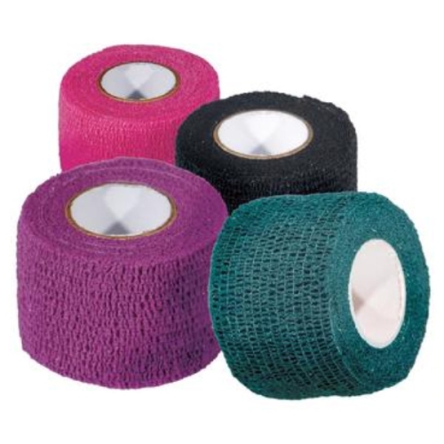 1.5" X 5 yards. Hand tear, Non-woven, cohesive, flexible bandages. Available in pink, black, purple, or dark green.