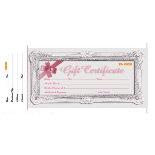 Designer gift certificates. Each one comes with a ribbon frame picture that is sure to be pleasing to your clients.