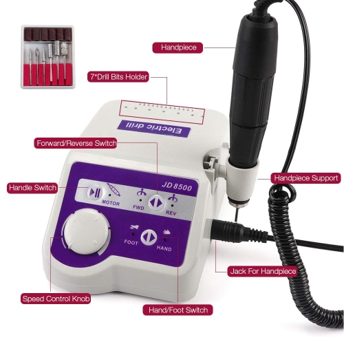Product Include: 1 x Main Machine, 1 x Handpiece, 1 x Foot Switch, 1 x Handle Support, 1 x Six Types Nail Drill Basic Bits, 1 x User Manual.